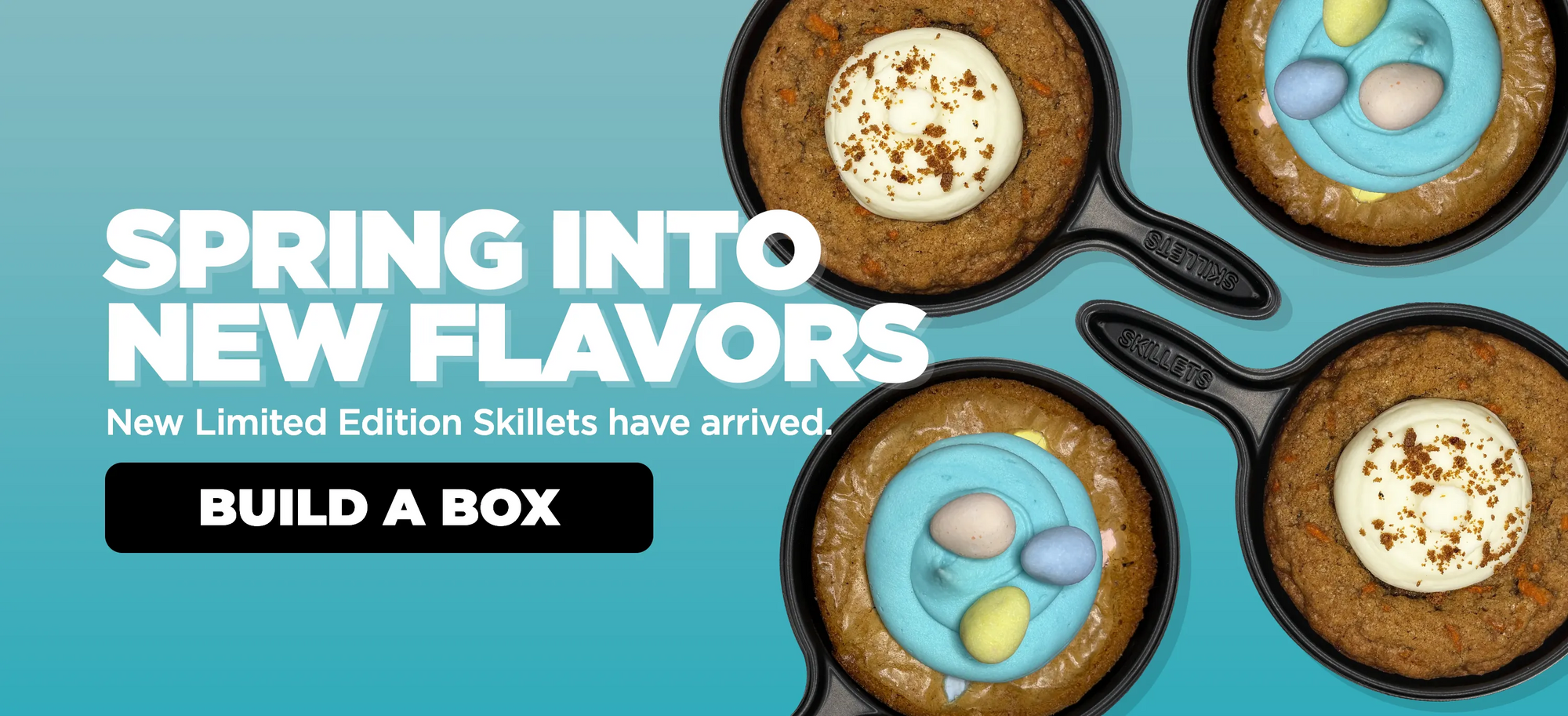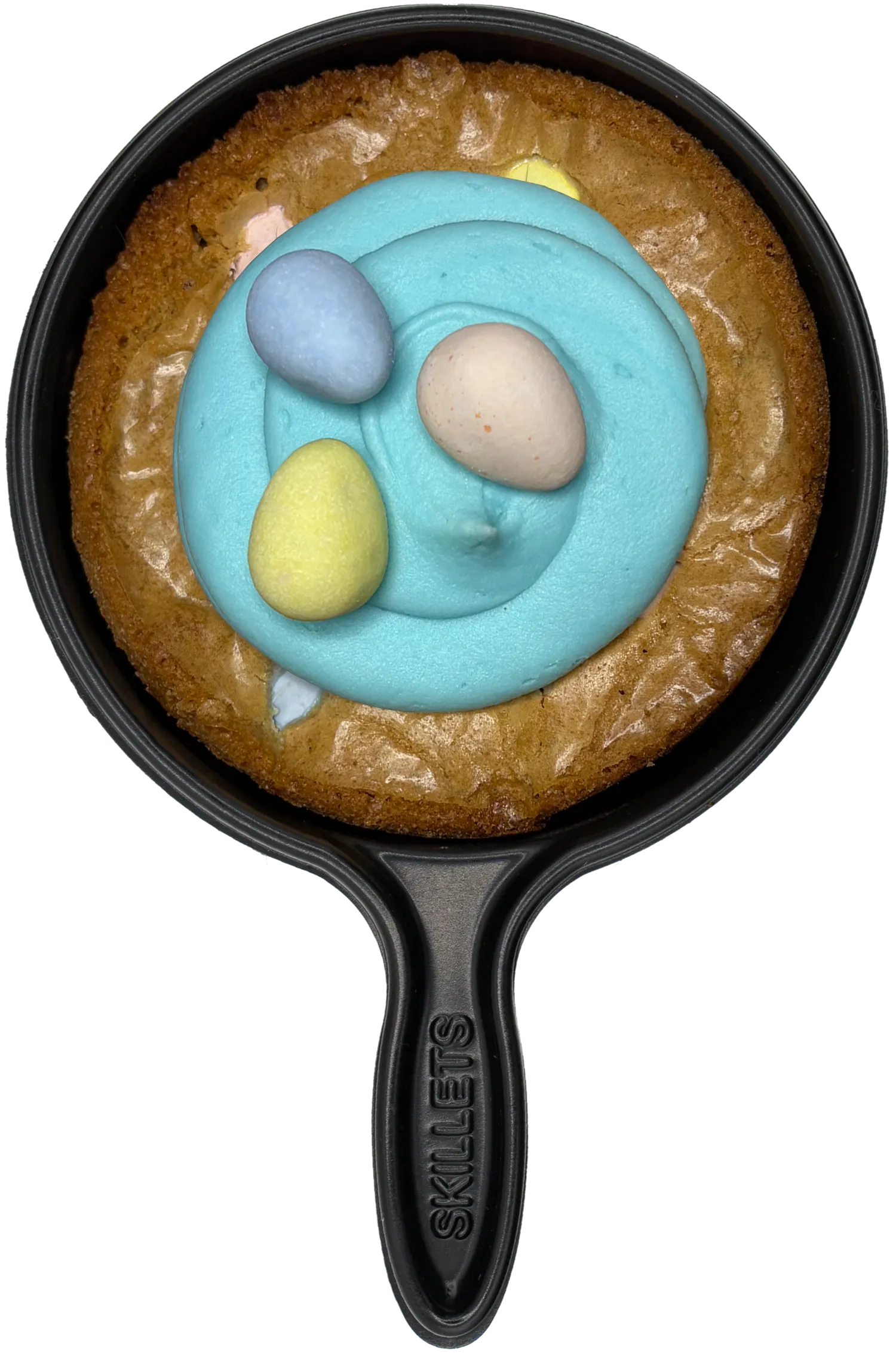 A soft, buttery blondie baked with rich brown sugar and milk chocolate discs, topped with a smooth spiral of blue buttercream and finished with chocolate eggs.